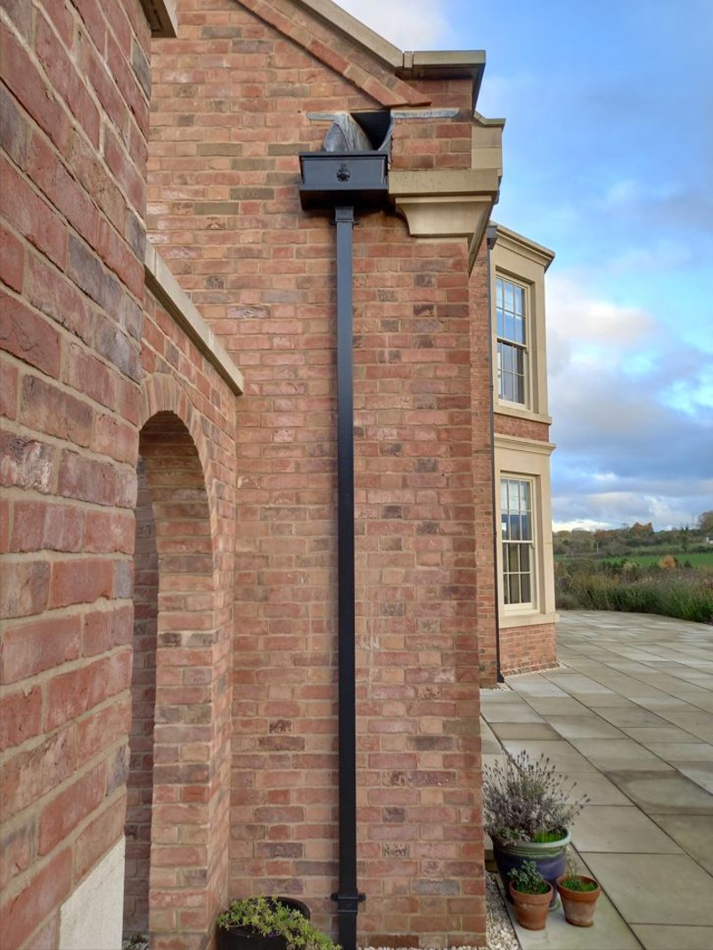 Ian and Julia selected the Marley Alutec Traditional Moulded Ogee 125 x 100 mm bolted gutter system and Traditional Square 102 x 102 mm downpipes. The Traditional Moulded Ogee range is manufactured to BS 8530, the original design standard for cast iron. In addition, the chosen Heritage Black finish features a textured surface to accurately reproduce the appearance of cast iron systems. Marley Alutec Ornamental Hoppers were also chosen to add further authenticity to the design of the house.